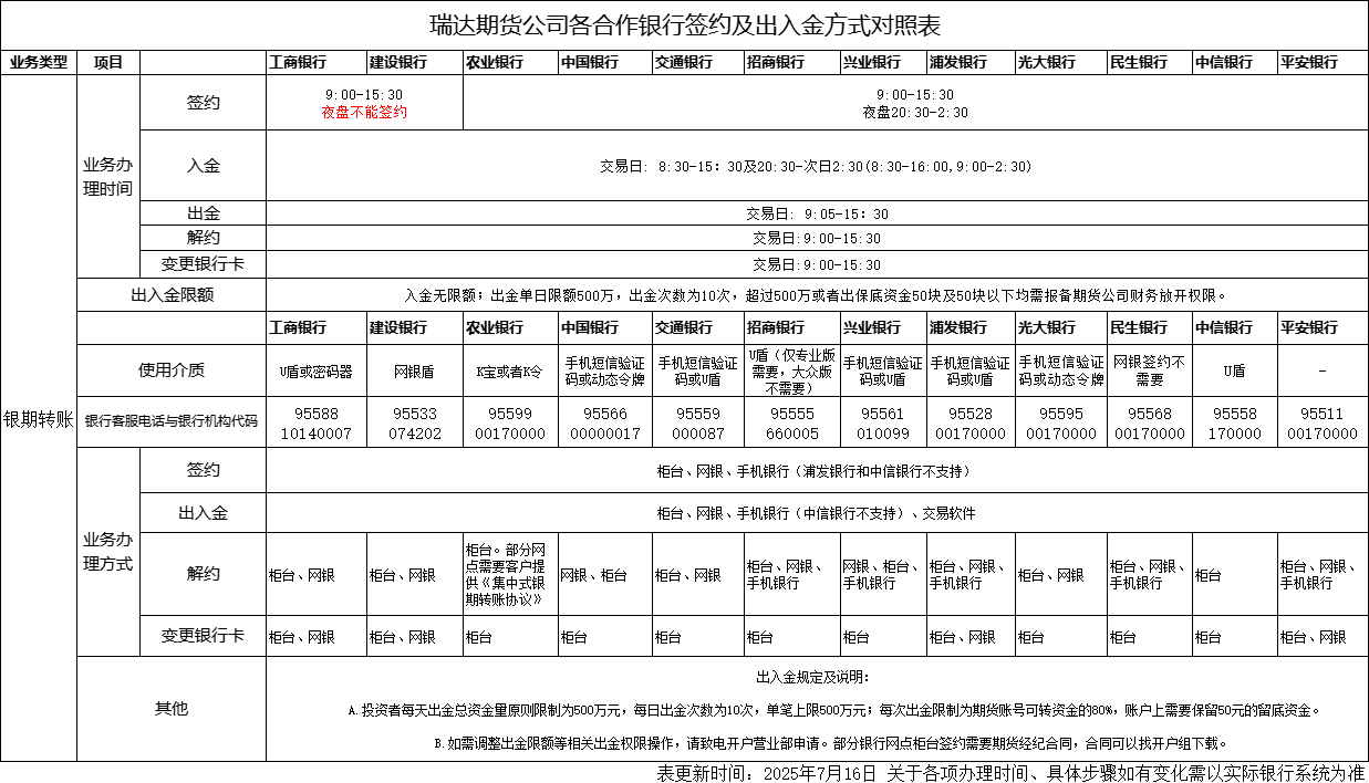 建设银行、交通银行、工商银行、农业银行、中国银行、兴业银行、民生银行、浦发银行、招商银行、光大银行、中信银行和平安银行。客户可选择上述十二家其中一家办理银期转账,每家银行目前只能绑定一张卡,也可以选择多家银行申请开通。
