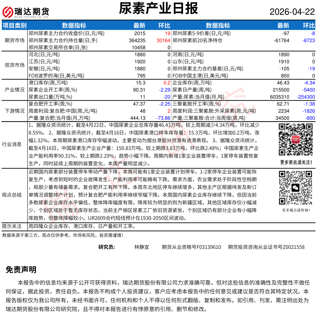 2026-04-22瑞达期货尿素产业日报20260422