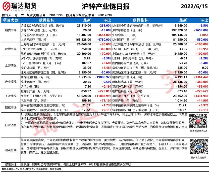 瑞达期货锌品种产业日报20220615