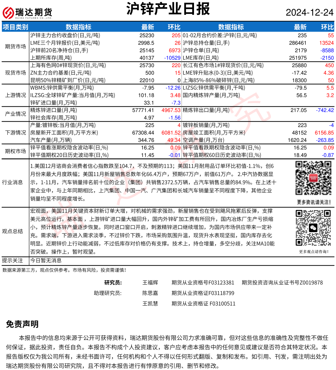 2025-12-24瑞达期货沪锌产业日报20251224