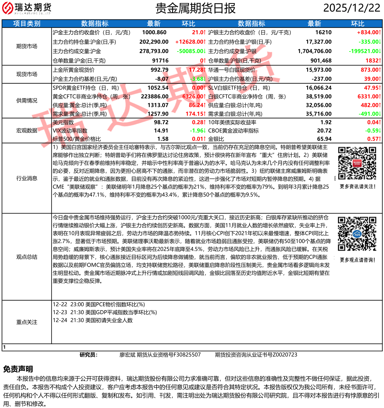 2025-12-22瑞达期货贵金属市场每日全景分析报告 20251222