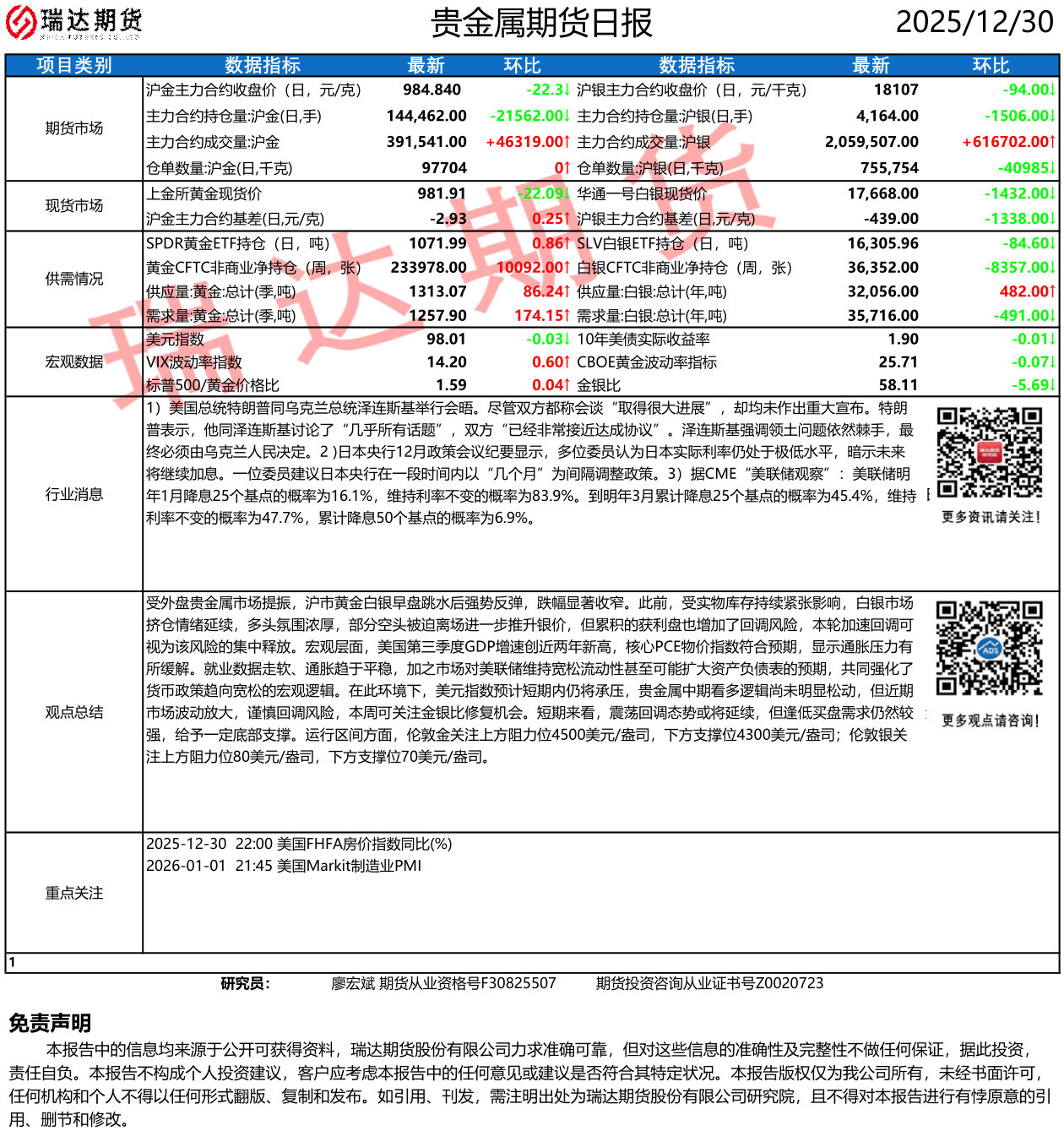 2025-12-30瑞达期货贵金属市场每日全景分析报告20251230