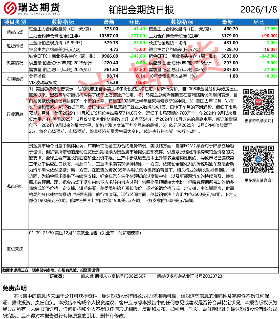 2026-01-09瑞达期货铂钯金市场每日全景分析报告20260108