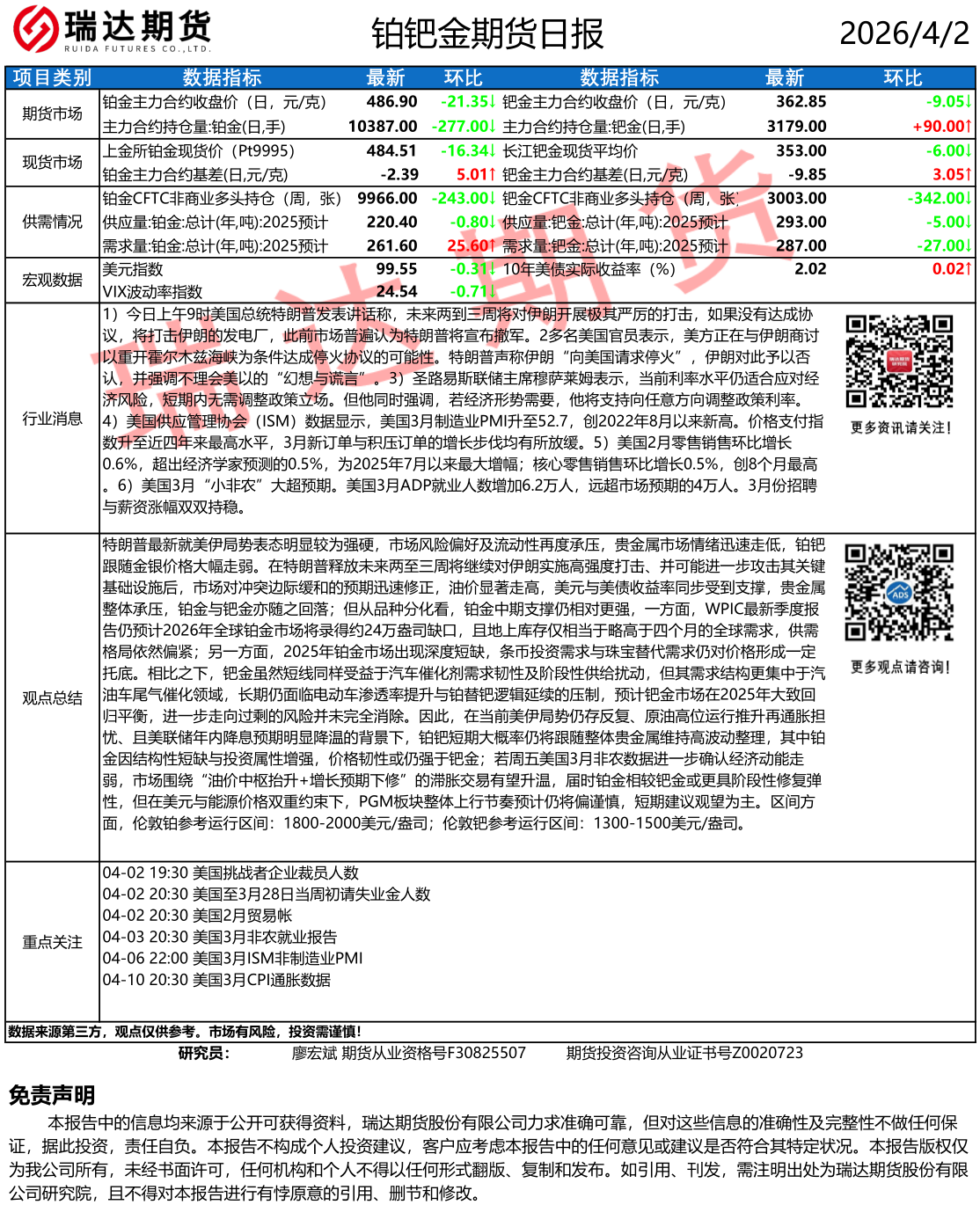 2026-04-02瑞达期货铂钯金市场每日全景分析报告 20260402