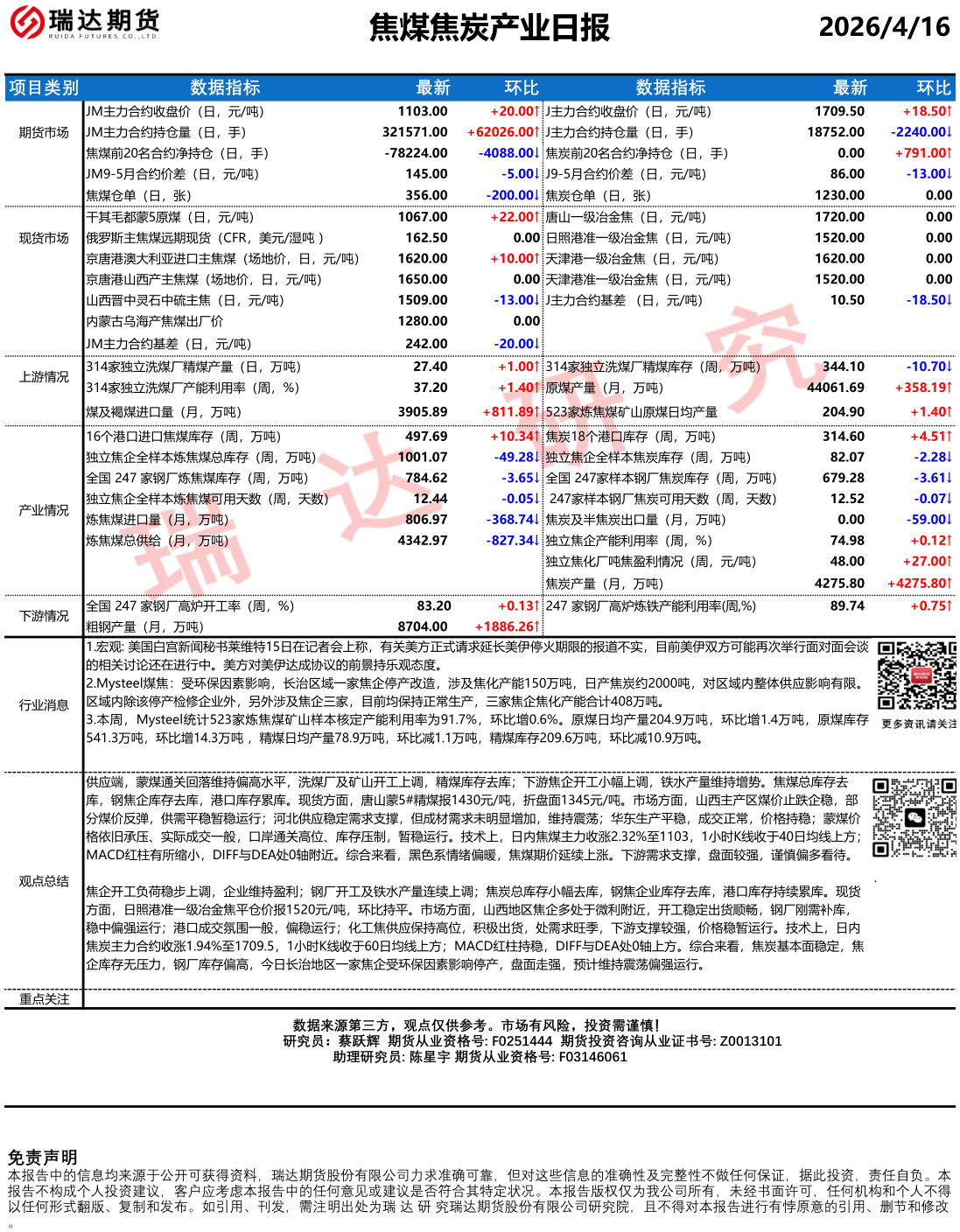 2026-04-16瑞达期货焦煤焦炭产业日报20260416