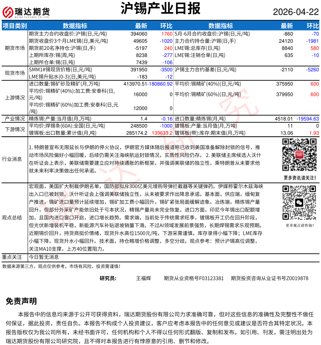 2026-04-22瑞达期货沪锡产业日报20260422
