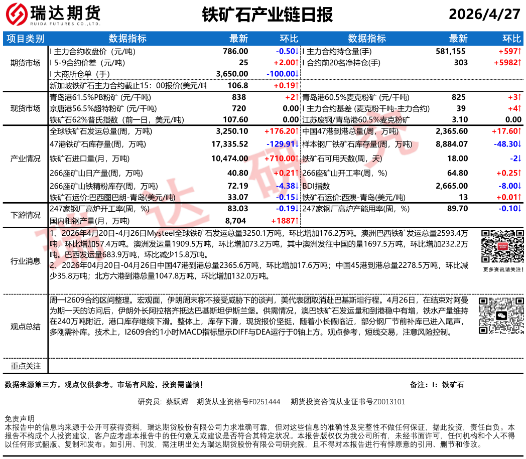 2026-04-28瑞达期货铁矿石产业日报20260427