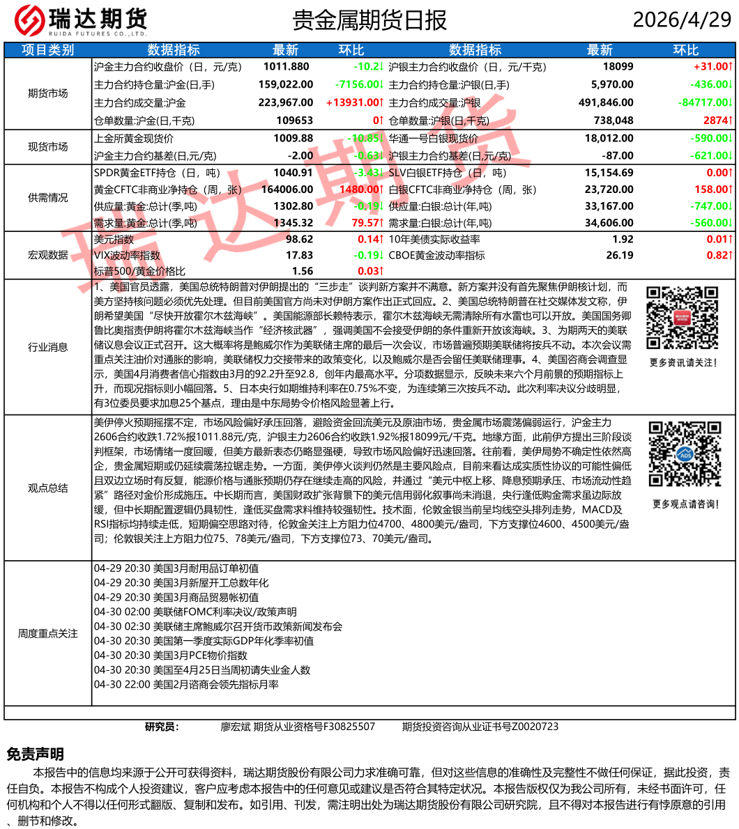 2026-04-29瑞达期货贵金属市场每日全景分析报告 20260429