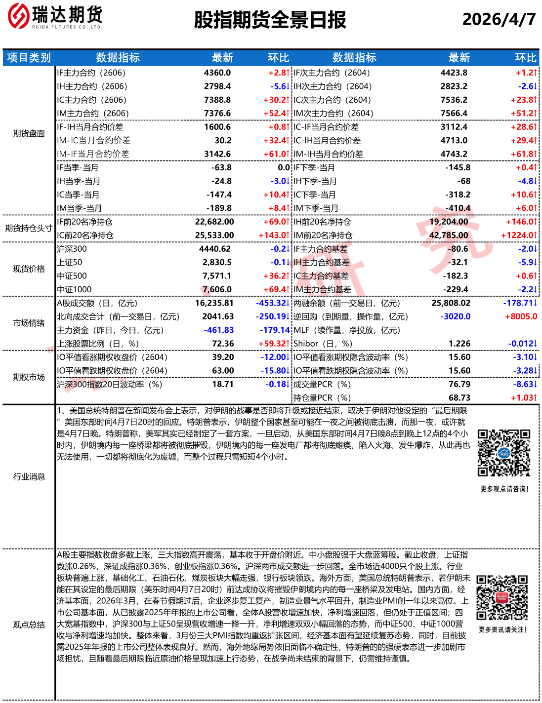 2026-04-16瑞达期货股指期货市场每日全景分析报告20260416