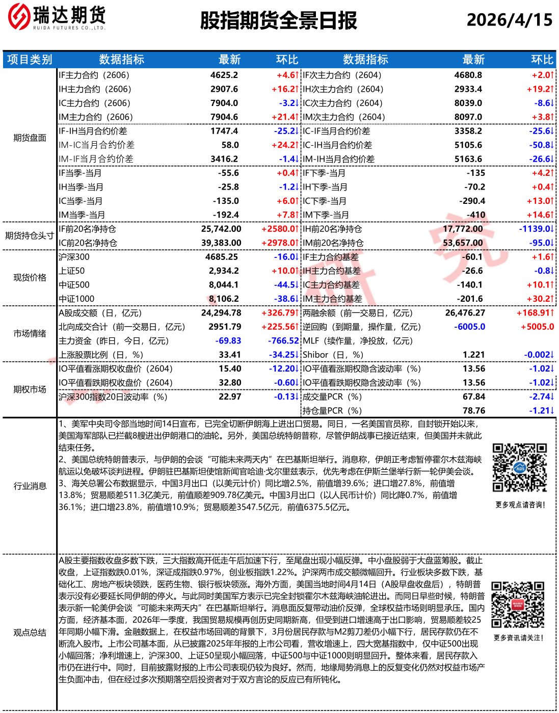 2026-04-16瑞达期货股指期货市场每日全景分析报告20260416