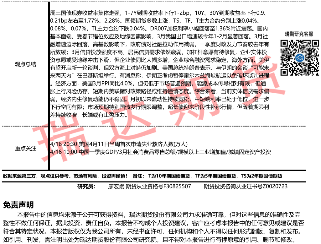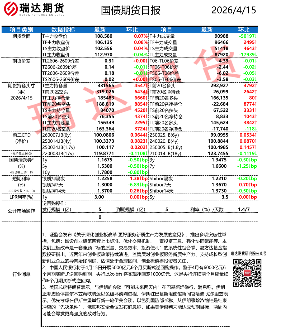 2026-04-15瑞达期货国债期货市场每日全景分析报告20260415