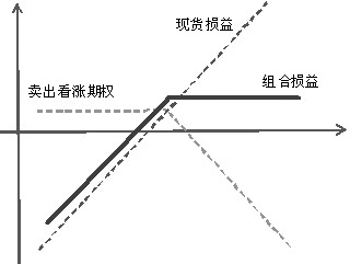 部分成熟投资者可能会站在期权卖方考虑,对市场走势研判短期不会大幅上涨,甚至可能微幅下跌时,进行卖出看涨期权进行套期保值,收入权利金,增加收益,此策略又称为备兑开仓。其损益图如下所示: