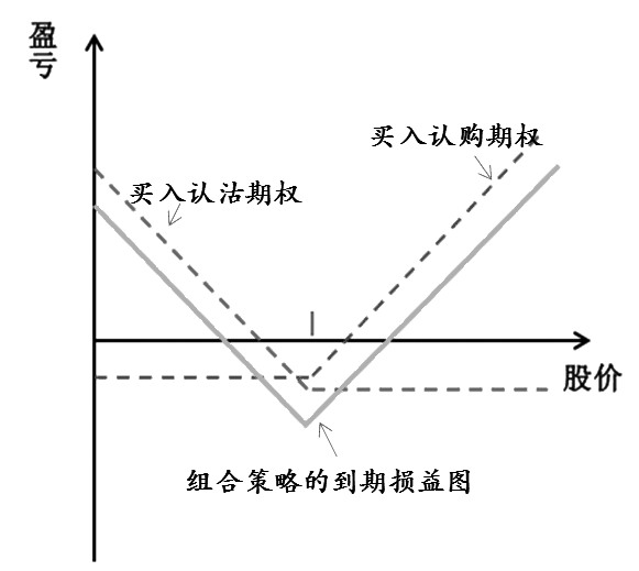 构建买入跨式策略,需要同时买入相同数量、相同到期日、相同执行价的认购和认沽期权。就好比同时买入了价格上涨保险和价格下跌保险,不论价格大涨还是大跌,只要保险单边获得的收益可以超过所支出的所有保费,就可以盈利。策略到期损益如上图所示,横轴之上是盈利,之下是亏损。从图中可以看出,策略的收益无限,而风险有限。举个例子:某股票现价100元,此时买入2月到期的执行价为100元的跨式策略,认购期权价格为5元,认沽期权价格为4元,那么策略成本就等于4+5=9元。当合约到期时,如果股票价格上涨高于109元,或者下跌低于91元,策略就有正的收益。