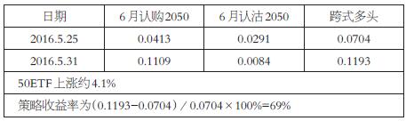 二是市场价格长期窄幅波动,无法辨明后市方向,但预计将发生大幅涨跌时入场。当技术分析面临较大的不确定时,也可以采用买入跨式策略。如去年5月6日和7日股市连续两天破位下跌,使得投资者人心涣散,随后的15个交易日都在箱体内小幅振荡盘整。增量资金入市犹豫,成交量明显趋于萎缩,并且连续出现地量。投资热点平淡,投资者观望情绪浓厚。一系列特征都显示市场正在筑底修复,可能迎来大涨,但不排除会出现4月底的“盘久必跌”行情。由于波动率持续下跌,期权价格相对便宜,可以择机买入跨式。50ETF在5月31日放量向上突破大涨3.4%,6月平值认购期权大涨逾300%,6月虚值认购期权则大涨逾500%。而认沽期权下跌最多的合约仅下跌60%,跨式策略获利丰厚。例如,5月25日买入6月2050跨式,截至5月31日收盘时策略收益如下表(不考虑手续费):