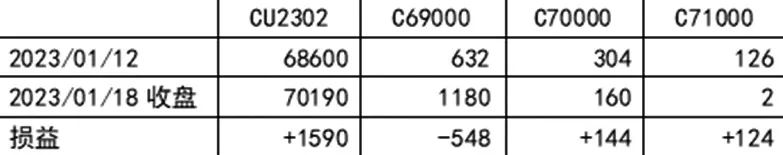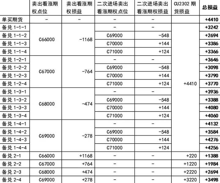 范例:2022年12月26日,某投资人甲持有铜期货CU2302多头部位,虽然长线持续看好,但甲认为短期上方空间似乎较为有限,因此进场卖出上方虚值铜看涨期权,贴补收入。不料后续铜期货逐步走扬,2023年1月12日,卖出期权的权利金膨胀至两倍,此时投资人甲在不同行权价的三个选择方式及最终结果,如下表所示: