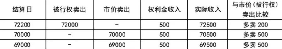 结算时沪铜期货市价在72000元/吨以上时,卖出沪铜期货的收入维持在72500元/吨。结算时沪铜期货市价在72000元/吨以下时,卖出沪铜期货的收入比市价多500元/吨。结算时沪铜期货市价在72500以下(行权价+权利金)时,价格锁定平仓策略较优。