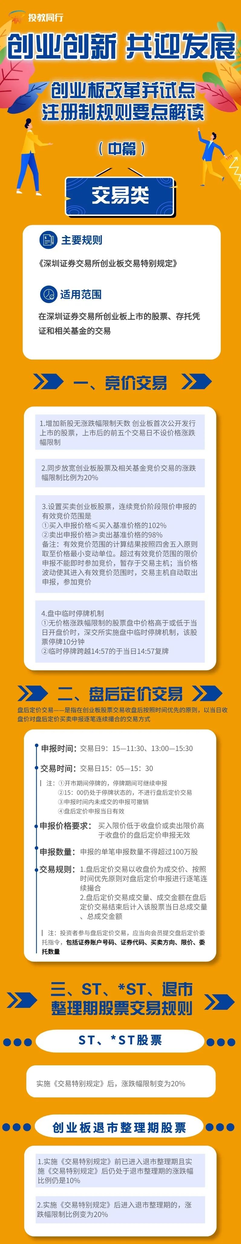 为引导投资者正确理解创业板改革的重大意义,理性参与创业板投资,2020年6月,深圳证监局、深圳证券交易所、深圳市证券业协会主办,“投教同行”成员单位安信证券承办了第十二期“创业创新 共迎发展”创业板改革专项投资者教育活动。“投教同行”制作了系列漫画,解读创业板改革的制度安排、运行机制,讲解创业板改革涉及的规章规范性文件、自律规则,帮助投资者及时、准确理解创业板改革制度要点。本期,让我们一起了解创业板改革并试点注册制规则要点(交易类)。