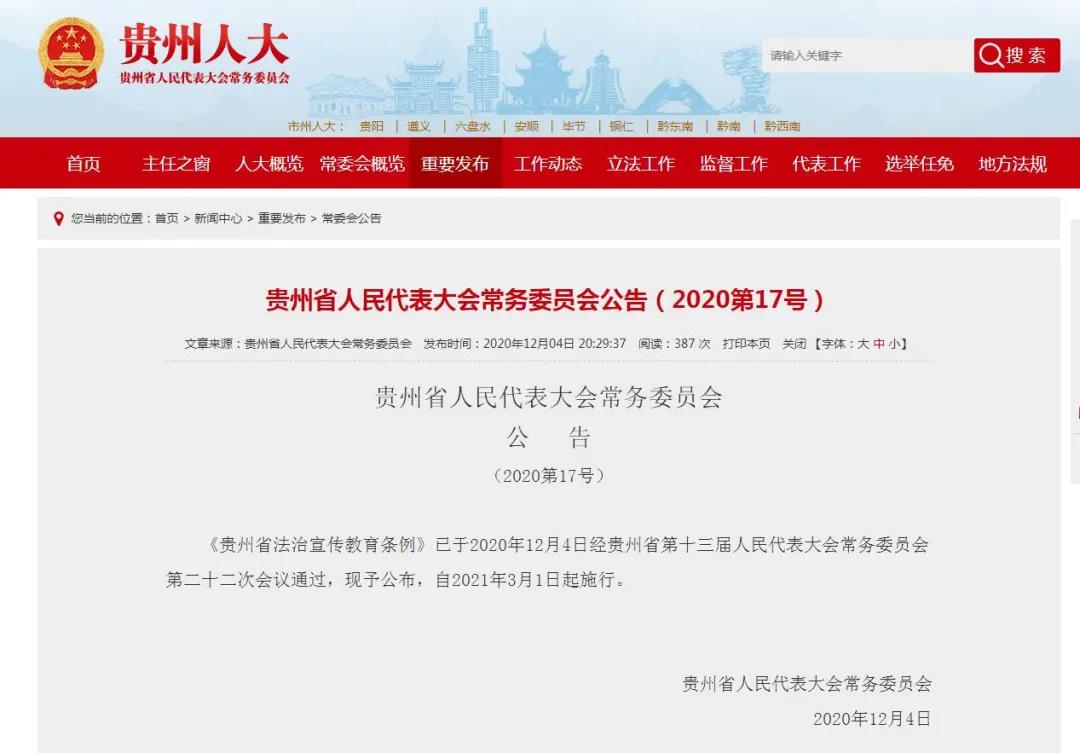 《贵州省法治宣传教育条例》(以下简称《条例》)已于2020年12月4日经贵州省第十三届人民代表大会常务委员会第二十二次会议通过,将于2021年3月1日起施行。