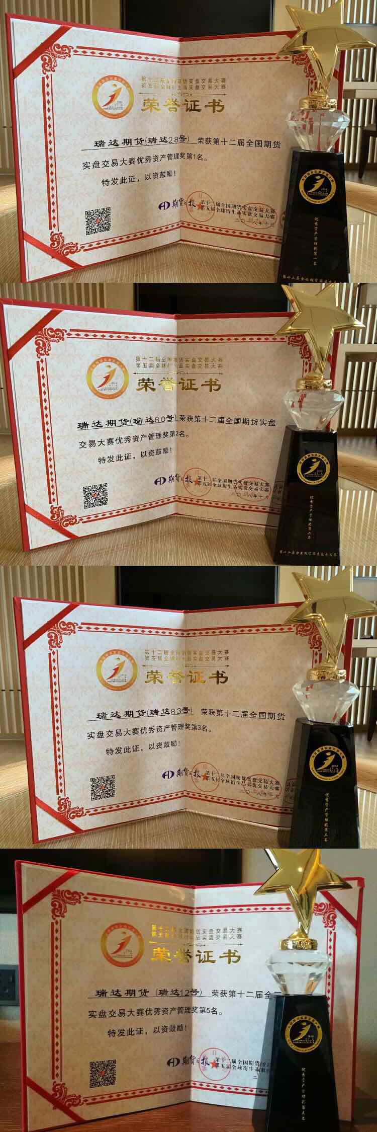 11月24日,由期货日报社联合证券时报社共同主办的 “第十二届全国期货实盘交易大赛”颁奖典礼在深圳隆重举行,瑞达期货旗下自主资管产品参加了资产管理组的评比,今年瑞达期货再发力,依据不同的投资策略囊括了资管组排名的冠军、第二名、第三名和第五名。