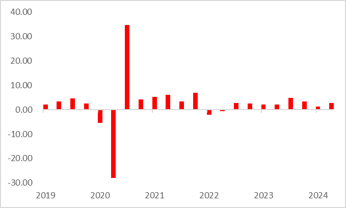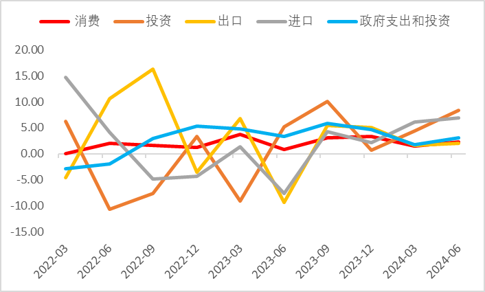 数据:2024年美国第二季度实际GDP初值环比折年率初值录得2.8%,较第一季度的1.4%有所上升,且高于市场预期的2%,数据反映出美国经济仍展现出一定的韧性。在劳动力市场缺口尚未完全修复的状况下,薪资增速于二季度继续扩张,居民收入得到一定支撑的情况下,在GDP中占比约为百分之七十的消费项便成为本季度经济增速的主力推手,消费支出于二季度环比折年率增长2.3%,较前值1.5%小幅回升,且高于预期的2.0%。商品消费支出增速(二季度:2.5%,一季度:-2.3%)较一季度大幅上升,其中耐用品消费增速显著走强,但整体增速较历史均值仍保有一定差距。服务业消费增速不升反减(二季度:2.2%,一季度3.3%),与先前CPI以及PMI数据中服务业相关价格增速持续下降吻合,或侧面反映高利率环境正持续给予需求水平一定压力。投资总额环比折年率录得8.4%,增速较一季度再次升高。其中非住宅及设备投资表现亮眼,环比折年率分别录得5.2%及11.6%,较前值4.4%及1.6%均显著上涨,或与美国企业于今年起加大对制造业及AI的相关投资有关。固定投资环比折年率于二季度录得3.6%,较前值7%大幅下降,其中建筑及住宅投资环比折年率分别录得-3.3%及-1.4%,较前值3.4%和16%大幅放缓,体现高利率环境对美国地产相关产业持续施压。除此之外,本月库存变化对GDP贡献率由负转正,制造、零售及批发商累库增速均有所回升。进出口在二季度受惠于贸易边际改善于一季度环比折年率录得4.9%,较前值4.5%有小幅上升。政府支出于二季度环比折年率录得3.1%,较前值1.8%有所回升。两者对GDP贡献率分别为-0.72%及0.53%,前值分别为-0.65%,及0.31%,因此对GDP拉动效果相互有所抵消。美国第二季度的经济增长超出预期,主要得益于私人消费、政府支出和投资支出的强劲增长,以及库存累库对GDP值的正向贡献值。然而,近期多数经济指标显示整体经济增速或有所放缓,其中6月份耐用品订单大幅下降(但扣除运输订单后仍然坚挺),新房和现房销售均超出预期下滑,消费者信心指数也持续下降。在通胀问题方面,6月份发布的PCE指数仅上涨0.1%,核心价格上涨0.2%,均符合预期;这也使得当前年通胀率回落至2.5%,有助于缓解年初通胀下行速度放缓所带来的担忧。结合本月初的非农数据来看,在失业率稳步上升且新增就业人口持续下降的情况下,市场对就业市场过热的担忧同样有所缓解。总体而言,尽管二季度GDP数据超出预期,但与去年下半年相比有所放缓,同时多数经济数据于近期走弱进一步加强市场对美联储9月降息的预期,美元指数及美债收益率在利率预期持续下调的影响下或将相对承压,但由于当前预期计价相对充分,整体价格或仍保有一定支撑。