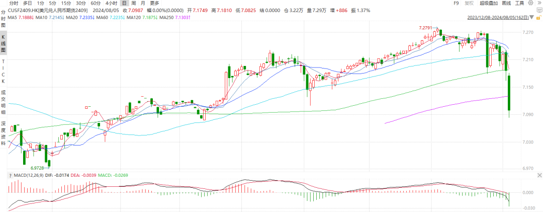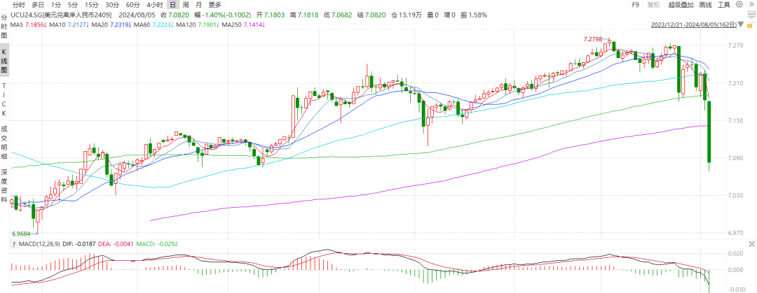 8月5日,受日元加息、美国就业数据不及预期综合影响,市场对全球经济衰退预期升温,导致美元、日元币值迅速回落,人民币兑美元大幅上涨。新交所主力合约UCU24收于7.0820,港交所主力合约CUSF2409收于7.0987,人民币日内分别涨逾1000、800个基点;自7月25日高点以来已升值逾1800、1650个基点。当日成交量分别高达19万手及6万手,均为2024年高点。图 1 新交所美元兑离岸人民币期货主力合约UCU24收盘价