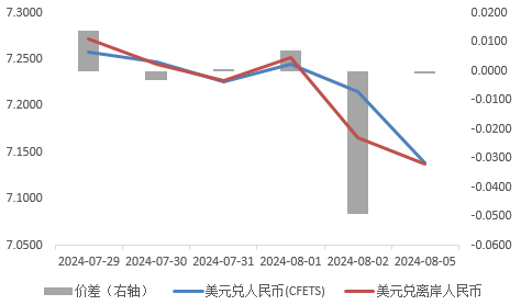 1、现货端汇率大幅波动。截止至8月5日,最新美元兑在岸人民币录得7.1430,较上一工作日继续下跌720点,环比下降1%;美元兑离岸人民币录得7.1354,较上一工作日下跌301点,环比下降0.42%;美元兑在岸/离岸人民币大幅下行,均已回落至2024年年初水平。现货端汇率的波动,使得期货端合约集体下行,并且距离24年1月份仍有一定下行空间。本次人民币汇率大涨主要受海内外两端因素共同影响。日本加息、美国数据不及预期均加深市场对经济的担忧,而我国扩内需政策的加码加力,为人民币币值上涨打下了良好基础。此外,新交所、港交所远月合约期价均低于近月合约,可以看出市场对人民币汇率接下来的走势维持信心,预期因素也将进一步支撑人民币。2、全球经济衰退预期升温。海外端因素我们认为共有两点:第一点是美元指数的走弱。最新数据显示,美国7月非农就业人口增长11.4万人,创2020年12月以来最低,远不及预期的17.5万人;失业率升至4.3%,连续第四个月上升,创2021年10月以来最高。非农回落、失业再创短期新高,都反应着美国经济下行压力的增大,以及通胀回落趋势的稳定。数据公布后,美联储多数官员表态由“鹰”转“鸽”,市场对美联储降息预期也有所增强。据CME工具显示,美联储9月会议降息50个基点的可能性从此前22%跃升至96.5%,并且增加了对美联储12月第三次降息的押注,美元支撑因素大幅减弱。第二点是日本央行超预期加息。7月31日,日本央行在货币政策会议上决定,将政策利率从0%至0.1%提高至0.25%左右。这是今年3月日本央行结束负利率政策以来首次加息。在高物价导致个人消费显低迷的背景下,加息或进一步打击居民消费意愿,从而影响个人消费水平。截止8月5日,日经225收跌12.40%,较7月11日高点下降24.34%。两点因素共同导致市场对全球衰退的预期有所升温。按照历史规律看,降息时点的到来将会进一步加剧市场对经济的担忧,对各类风险资产价格或带来较大波动。3、国内政策端持续加码加力。7月份我国二十届三中全会及政治局会议召开,共提出300多项重要改革举措,助力我国经济从高速增长阶段转向高质量发展。会议强调“提振消费为重点扩大国内需求,经济政策的着力点要更多转向惠民生、促消费”。在货币政策上,明确提及“促进社会综合融资成本稳中有降”。逆回购、MLF、存款利率、LPR等利率陆续调降,为我国经济发展打下良好基础,后续降息降准等刺激性政策或持续推进。而在财政政策上,首次明确强调“加快专项债发行使用进度,用好超长期特别国债,支持国家重大战略和重点领域安全能力建设,更大力度推动大规模设备更新和大宗耐用消费品以旧换新”。7月24日财政部发布《关于加力支持大规模设备更新和消费品以旧换新的若干措施》的通知,将安排1480亿元超长期特别国债资金,用于设备更新专项支持政策。超长期特别国债的进一步发放,助推我国经济持续好转。本次人民币汇率大涨主要受海内外两端因素共同影响,海外端原因有日元加息、美国就业数据不及预期所引发的全球经济衰退担忧,导致美元、日元币值迅速回落。而与海外截然不同的是,我国新一轮消费刺激政策再度加码加力,逆回购、MLF、存款利率、LPR等利率陆续调降,超长期特别国债进一步发放,为我国经济基本面打下夯实基础,叠加外需持续回暖,以及我国较为丰富的汇率管理工具,有望加速达成扩内需、稳经济的目标,未来人民币走势料稳步上行。本报告中的信息均来源于公开可获得资料,瑞达期货股份有限公司力求准确可靠,但对这些信息的准确性及完整性不做任何保证,据此投资,责任自负。本报告不构成个人投资建议,客户应考虑本报告中的任何意见或建议是否符合其特定状况。本报告版权仅为我公司所有,未经书面许可,任何机构和个人不得以任何形式翻版、复制和发布。如引用、刊发,需注明出处为瑞达期货股份有限公司研究院,且不得对本报告进行有悖原意的引用、删节和修改。