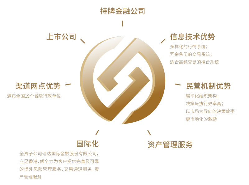 瑞达期货股份有限公司创建于1993年,目前在全国设立40多家分支机构,覆盖全国主要经济地区,是国内大型全牌照期货公司。公司经营范围涉及金融期货经纪、商品期货经纪、期货投资咨询、资产管理业务;并通过全资子公司瑞达新控开展风险管理业务;瑞达国际金融股份有限公司倾全力为个人及企业机构客户提供完善及可靠的境外风险管理服务、交易通道服务、资产管理业务;瑞达基金开展公开募集证券投资基金管理、基金销售业务;瑞达瑞控开展金融科技业务。是目前国内拥有分支机构多、运行规范、管理先进的专业期货经营机构。已在深圳证券交易所挂牌上市,成为深交所期货第一股、是第二家登陆A股的期货上市公司。