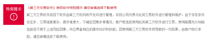 特别提示:第三方交易软件类目下软件由第三方机构所开发并进行管理,非我公司负责对此类交易软件进行管理和维护。由于存在条件设定多、交易链接复杂、操作难度大、不确定因素多等情况,客户若选择使用此类第三方软件进行交易,使用前需充分知晓包括但不限于上述风险因素,并应具备相应的操作知识和技能,因使用第三方交易软件而导致的一切后果,由客户自行承担,请您审慎选择下载。