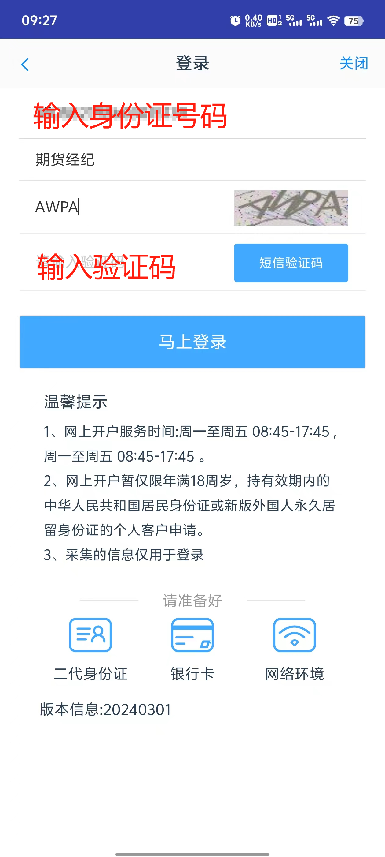 注意:开户云新用户将会提示录入手机号,老用户获取的短信验证码将直接发送到预留手机号中(如遇无法正常接收短信,请联系我司工作人员)