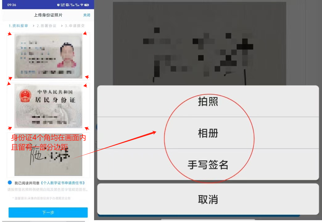 5上传身份证正面、反面照片、个人签名,阅读并同意数字证书安全责任书