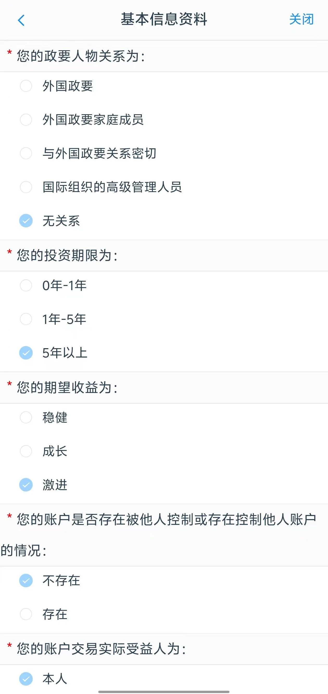a.进入到“个人基本资料”页面,会看到有部分信息是已经默认填写的,这都是根据上传的身份证资料自动获取的。如果获取的信息有不正确的地方可以自行修改。基本资料前端标“ ”的为必填选项,需要投资者按照真实意愿填写期货公司设置的所有带“ ”的必填项信息。