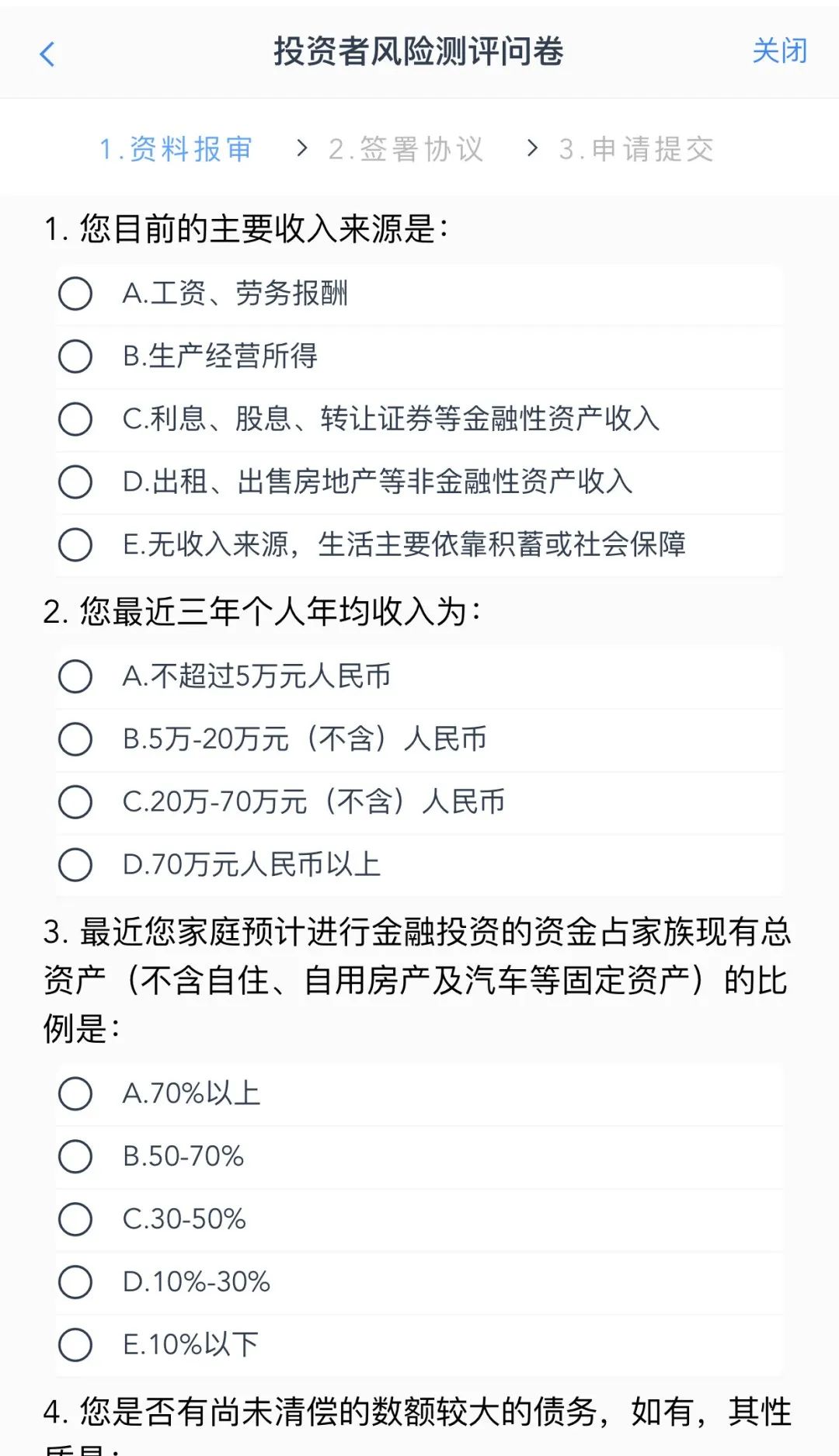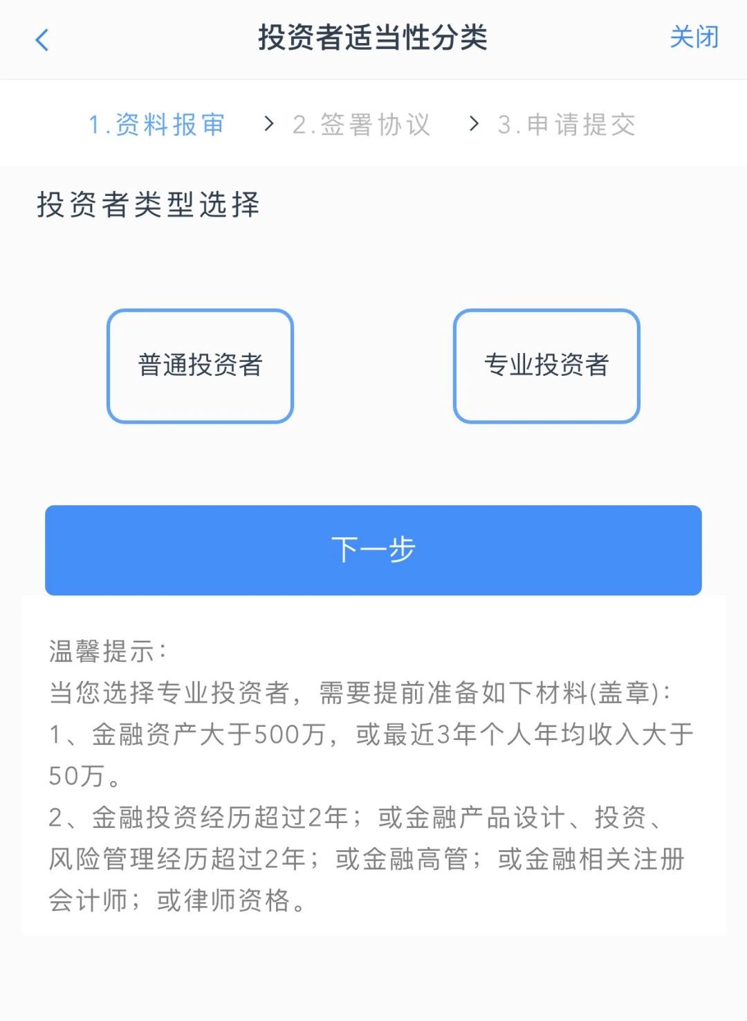 选择专业投资者,点击“下一步”进入到专业投资者信息采集问卷页面。