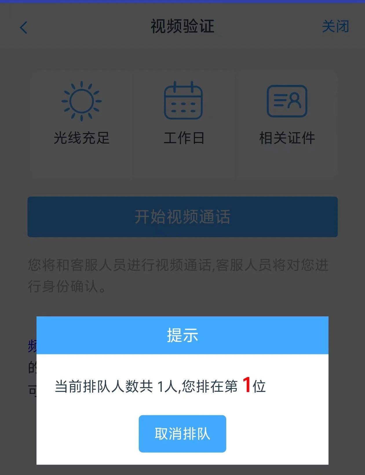 b.客户点击“开始视频通话”,会出现一个排队页面,此页面显示的人数是当前营业部所有用户的数量,包括本人。