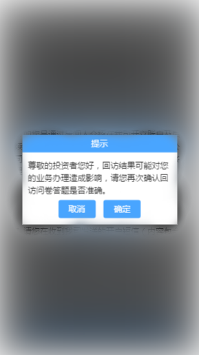若点击“坚持开户”,弹出第二次告知如下图所示,点击“重新风险测评”则直接进入投资者风险测评问卷页面,点击“放弃开户”则直接退出。
