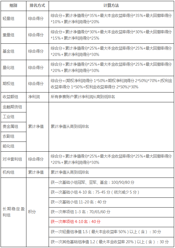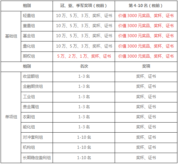 2.9 比赛结束后,轻量组单位累计净值大于等于1.5或者最大本金收益率大于等于50%,重量组、基金组、量化组单位累计净值大于等于1.2或者最大本金收益率大于等于20%的账户,均可获得参赛“优秀奖”荣誉证书。期权组排名前50名,且有期权交易的天数不低于10天,可获得参赛“优秀奖”荣誉证书。