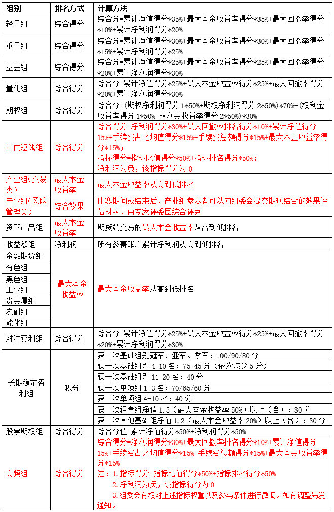 2.3 参赛者所在基础组别根据权益及出入金情况自动调整,具体如下:(参赛当日的上日权益+累计净出入金)及日均可用权益<100万元,调整为轻量组;100万元(含)<(参赛当日的上日权益+累计净出入金)及日均可用权益<500万元(不含),调整为重量组;500万元(含)<(参赛当日的上日权益+累计净出入金)及日均可用权益,调整为基金组。组别调整之后,成绩继续保留。