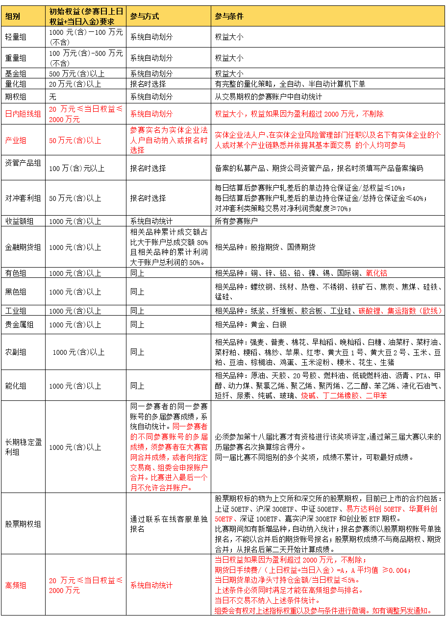 量化组账户(参赛当日的上日权益+累计净出入金)及日均可用权益<20万元,对冲套利组账户(参赛当日的上日权益+累计净出入金)及日均可用权益<50万元,均则转到轻量组继续比赛,成绩保留;如上述条件再度满足量化组或对冲套利组要求,继续回到原组别参赛,成绩保留。