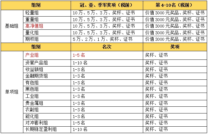 2.7 比赛结束后,轻量组累计净值大于等于1.5或者最大本金收益率大于等于50%,重量组、基金组、量化组累计净值大于等于1.2或者最大本金收益率大于等于20%的账户,均可获得“优秀奖”荣誉证书。期权组排名前50名,且有期权交易的天数不低于10天,可获得“优秀奖”荣誉证书。资管能力评级三星以上者可获得“优秀奖”荣誉证书。