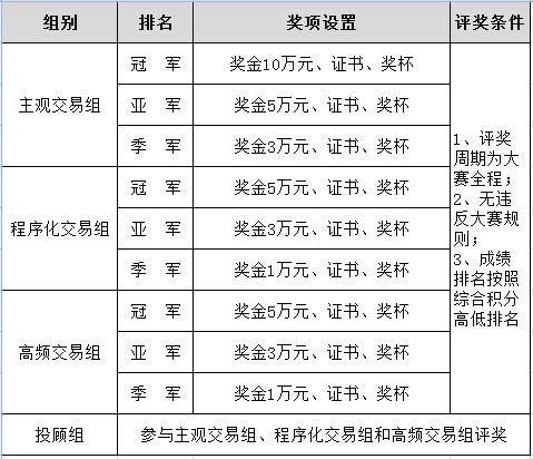 初始报名可选择主观交易组或程序化交易组,如满足投顾组条件的亦可同时报名参加投顾组;报名程序化组的选手,在获奖前提下,大赛组委会有权要求程序化交易账户提供交易日志。
