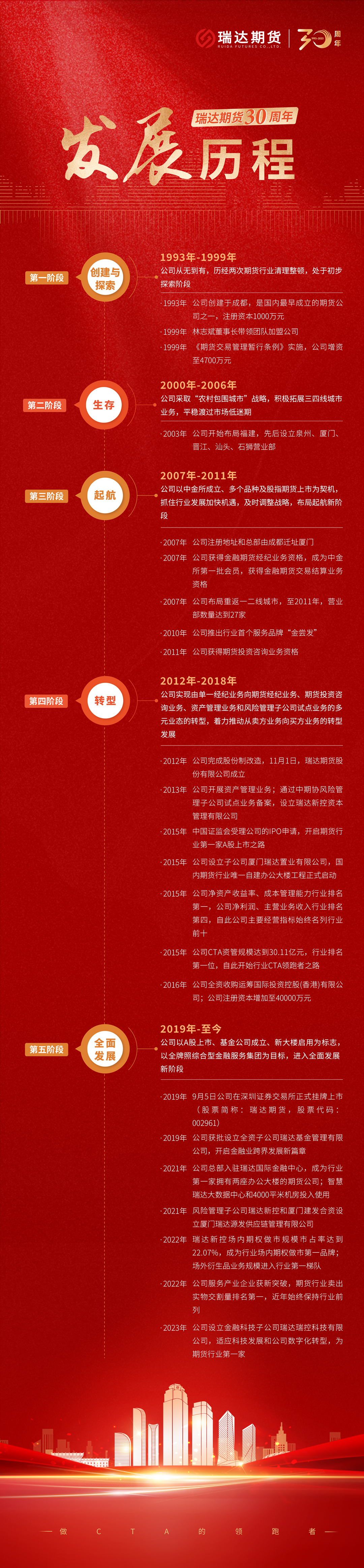 2023年11月1日,瑞达期货迎来了三十周年庆。三十年的日新月异,见证了瑞达期货飞速发展的历程。三十年的踔厉奋发,成就了瑞达期货不断腾飞的金融梦想。三十年里,瑞达期货立足服务实体经济的功能定位,开启多元发展之路,在人才建设和合规管理上齐头并进,在期货市场上一次又一次实现自我超越,为期货市场培养了众多的专业人才,为期货市场的发展贡献出了坚定的力量。三十年是时间的跨越,更是奋斗的新起点。展望未来,瑞达期货将以三十周年为发展契机,坚持发挥期货及衍生品市场的作用,服务实体经济,稳固多元业态发展格局,扩宽经营思路,坚持走高质量发展之路,向着更高,更强,更远的目标迈进,续写下一个辉煌篇章。[详细]