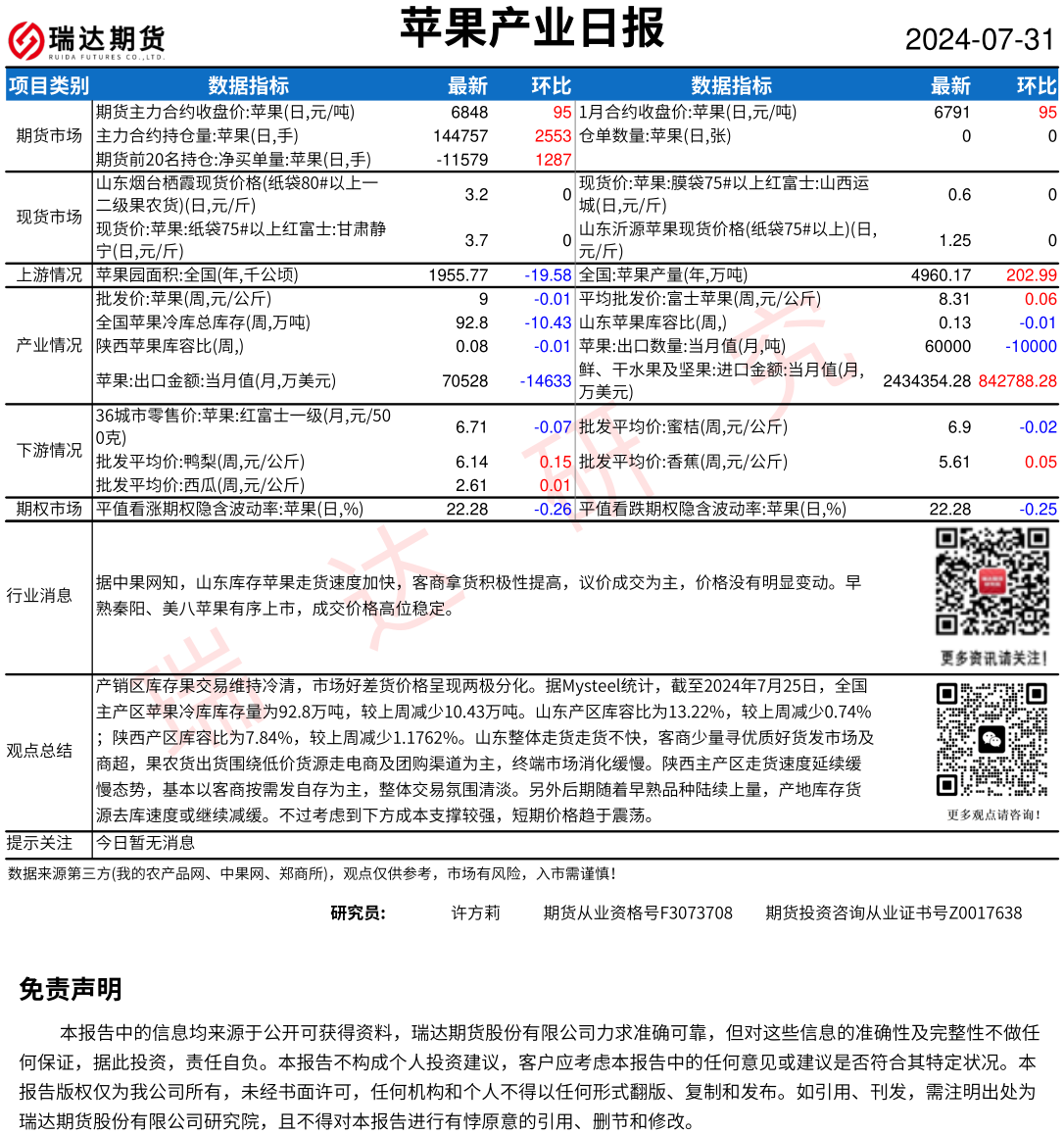 瑞达期货苹果产业日报20240731