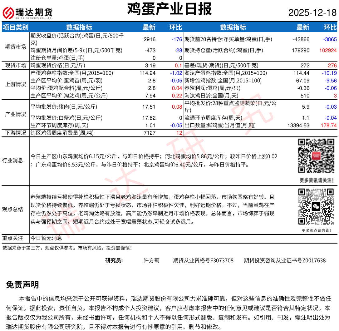 2025-12-18瑞达期货鸡蛋产业日报20251218