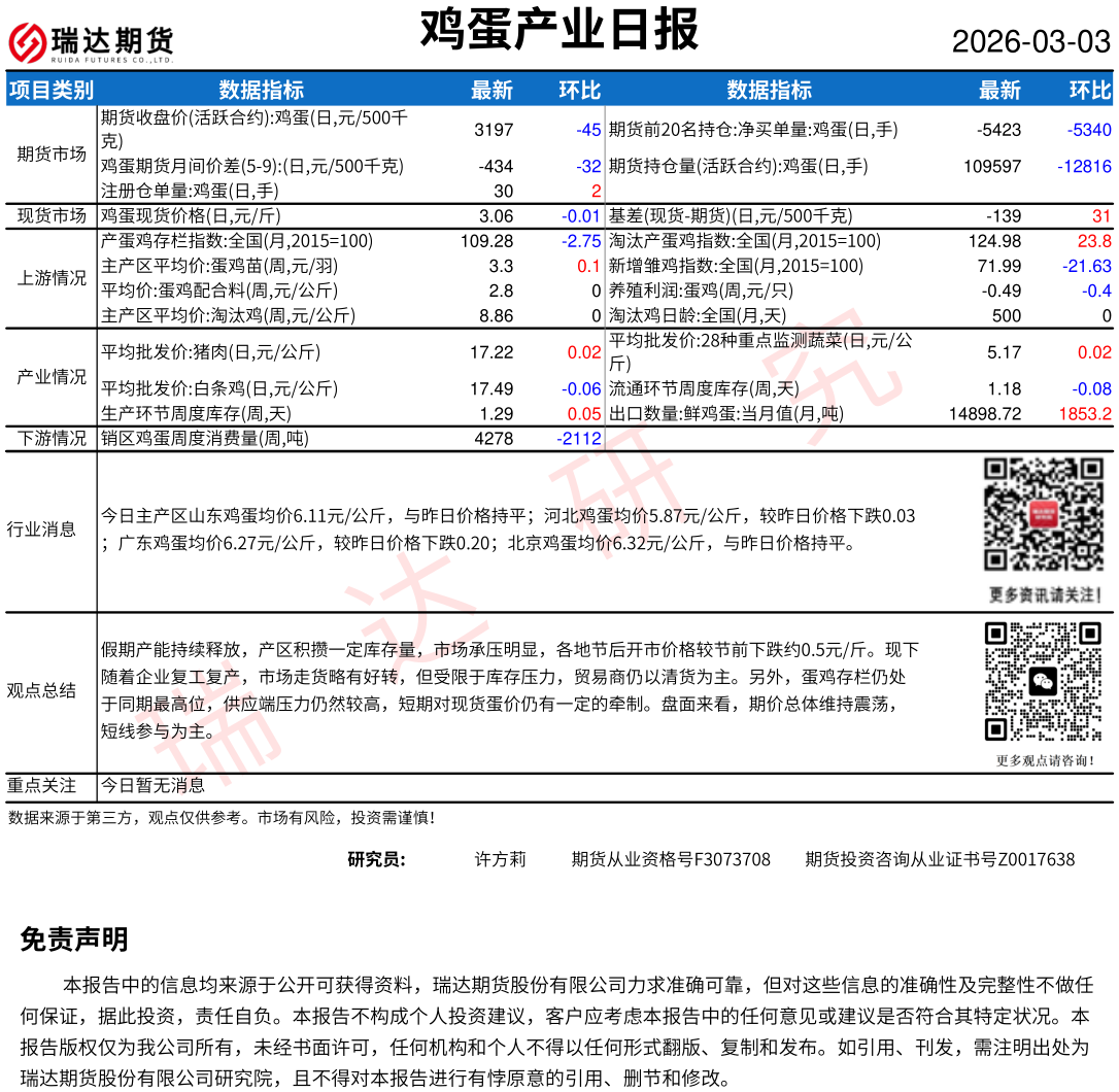 2026-03-03瑞达期货鸡蛋产业日报20260303