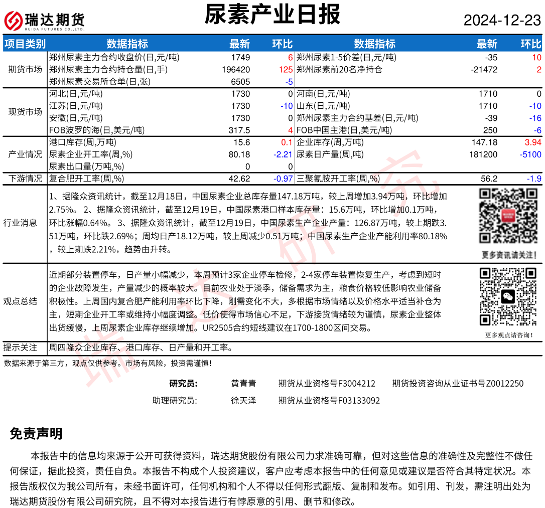 2025-12-22瑞达期货尿素产业日报20251222