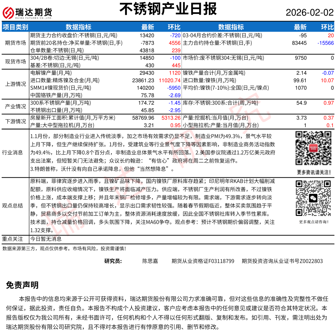 2026-02-02瑞达期货不锈钢产业日报20260202