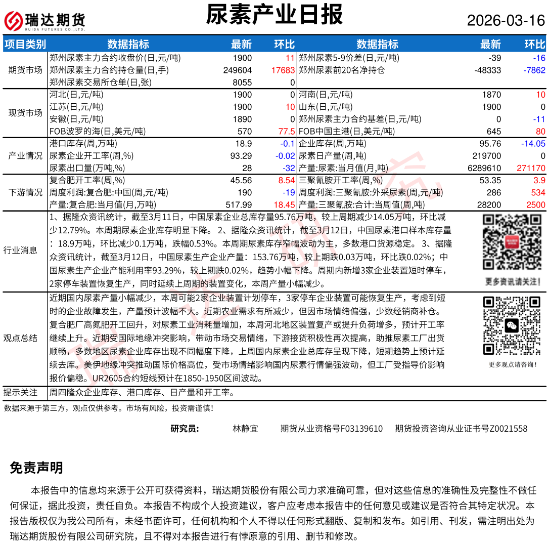 2026-03-16瑞达期货尿素产业日报20260316