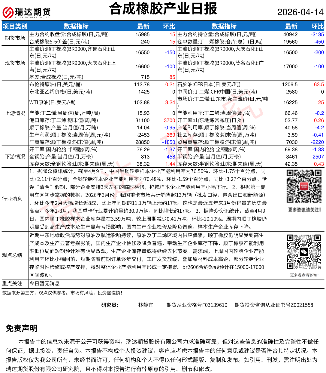 2026-04-16瑞达期货天然橡胶产业日报20260416