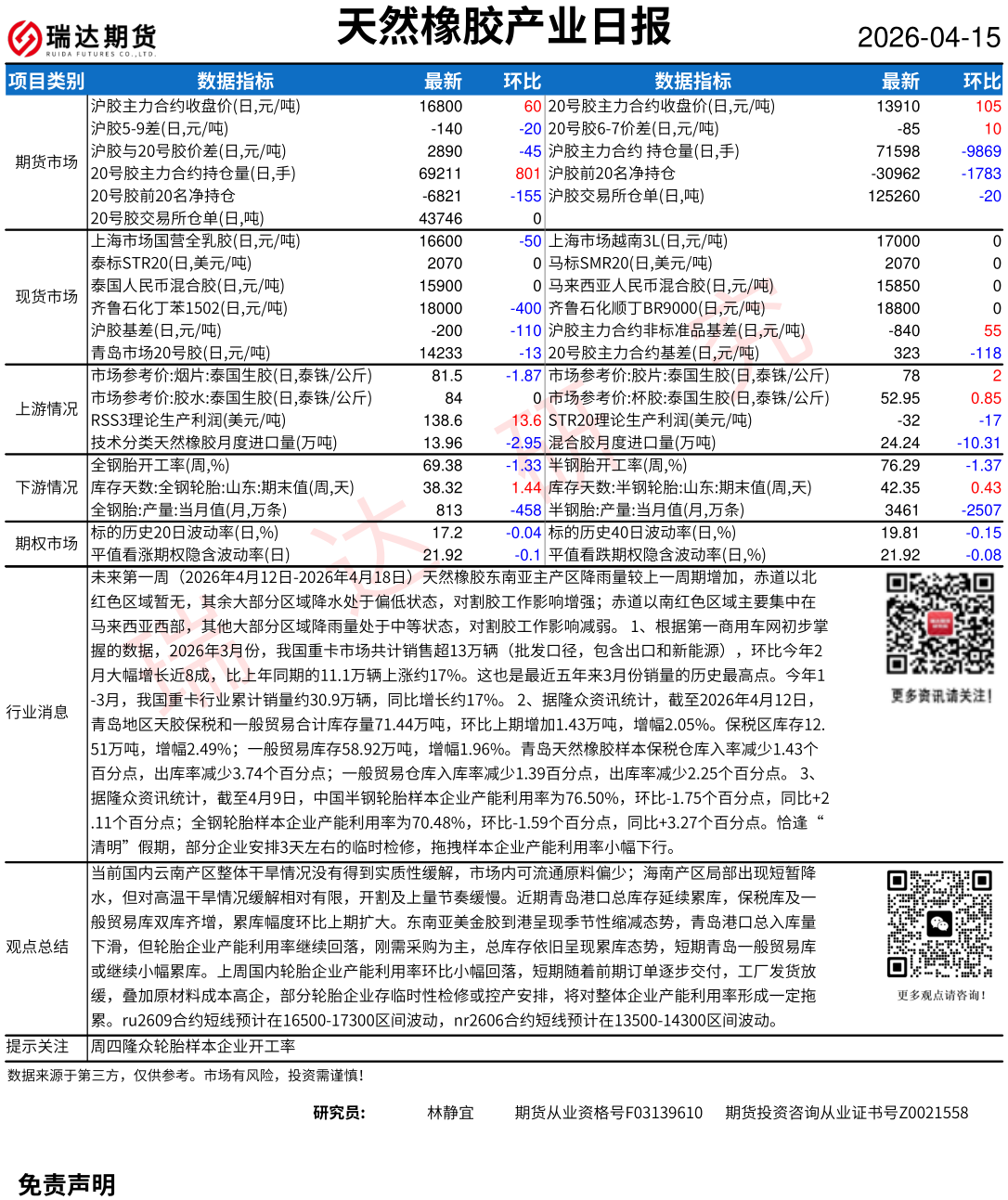 2026-04-15瑞达期货天然橡胶产业日报20260415