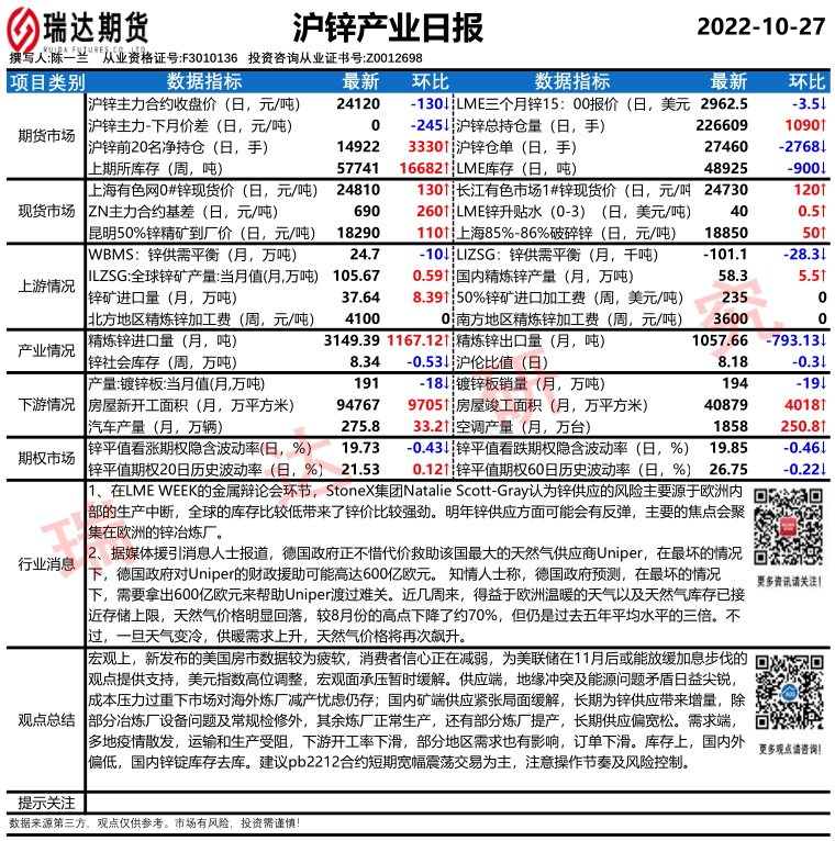 瑞达期货沪锌产业日报20221027