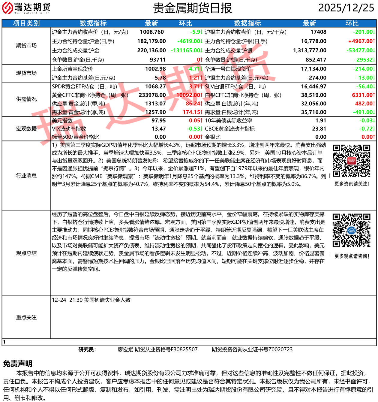 2025-12-25瑞达期货贵金属市场每日全景分析报告20251225